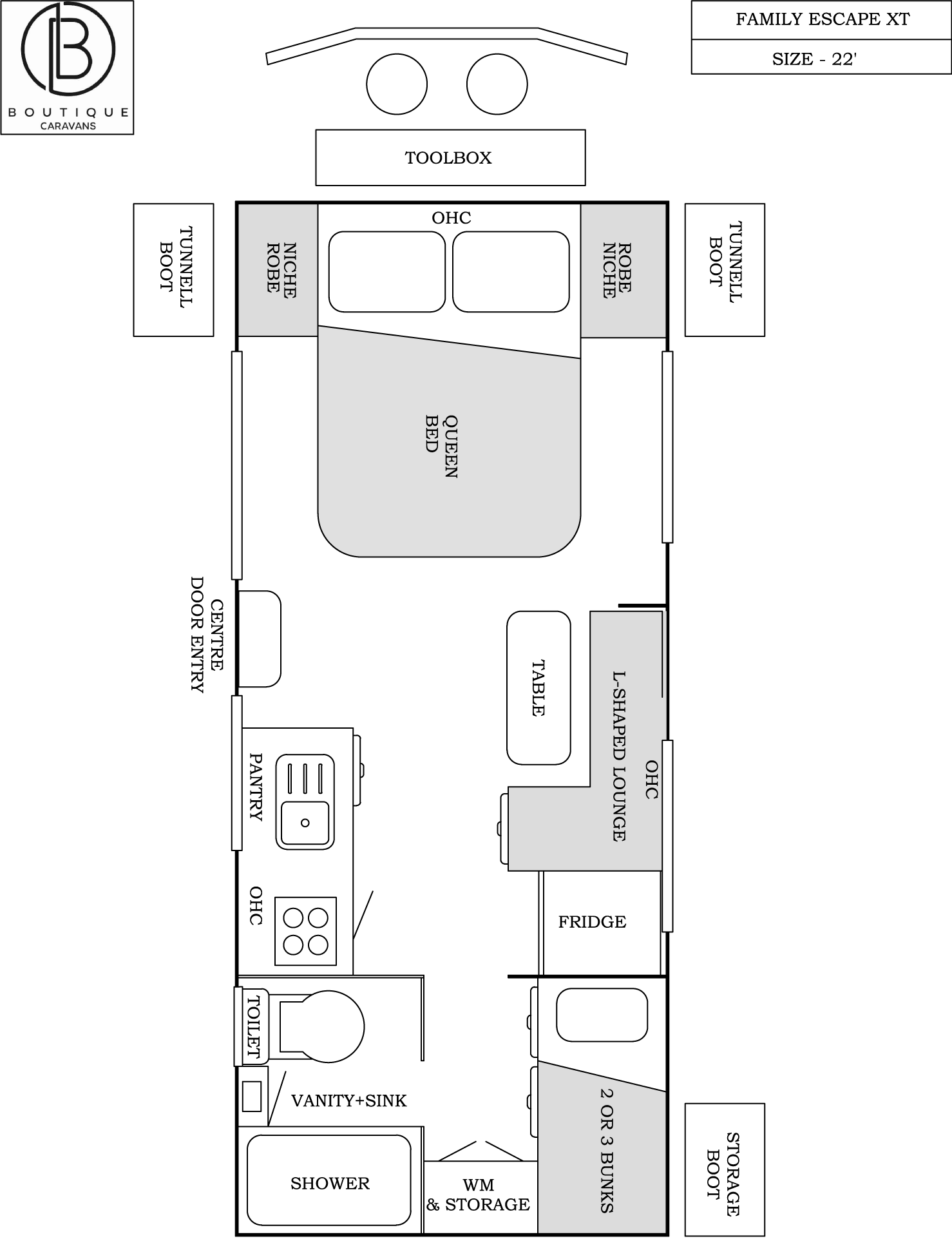 Introducing the Boutique – Family Escape-XT, where ruggedness meets refinement. This exceptional caravan combines elegance and durability, allowing you to explore challenging terrains with unmatched sophistication. Its sleek exterior, robust chassis, and all-terrain capabilities make it the perfect companion for off-road adventures with your family. Step inside to discover a luxurious interior, thoughtfully designed with premium materials and intelligent space utilization. Equipped with cutting-edge technology, this caravan ensures convenience and enjoyment on your journey. Experience the new standard in off-road sophistication with the Off-Road Boutique Caravan, where adventure and elegance converge.